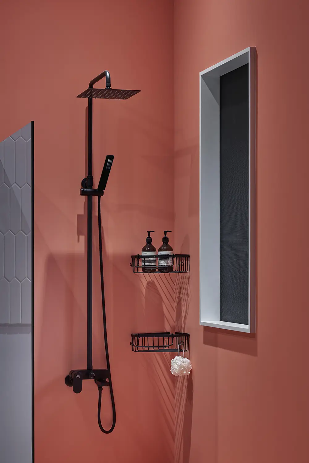 深色產品因色澤較深,在使用過程中容易因水中礦物質與皂垢的殘留,於表面形成白色水痕或水垢,視覺上較為顯眼,建議定期(1-2週)以中性 / 天然清潔劑,搭配乾淨的軟布擦拭保養。