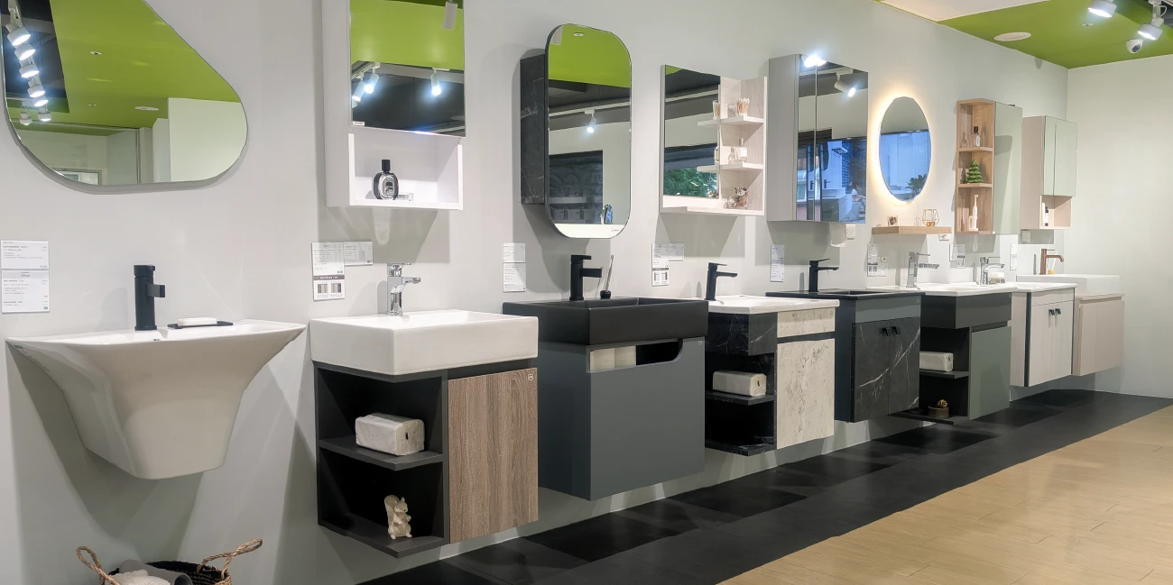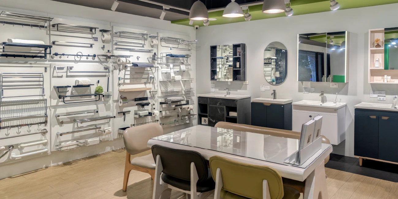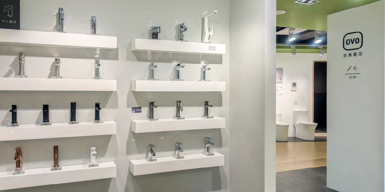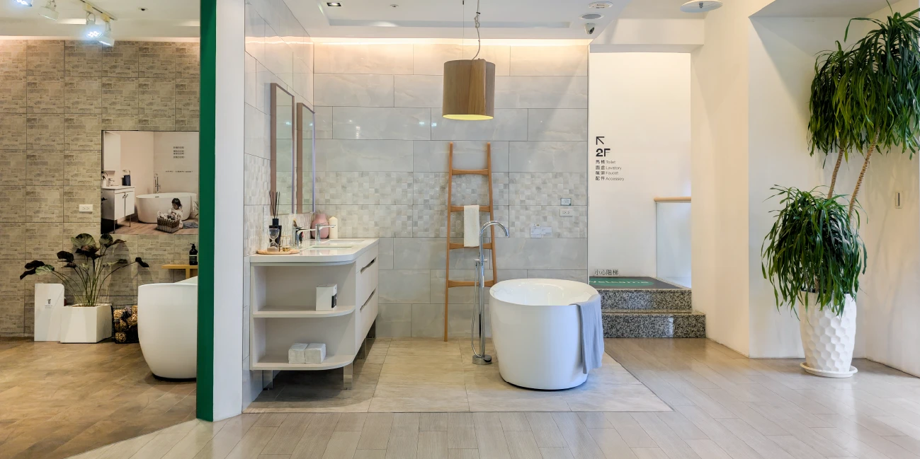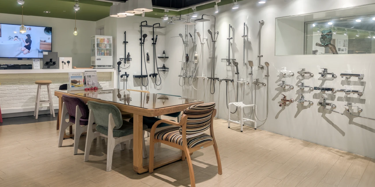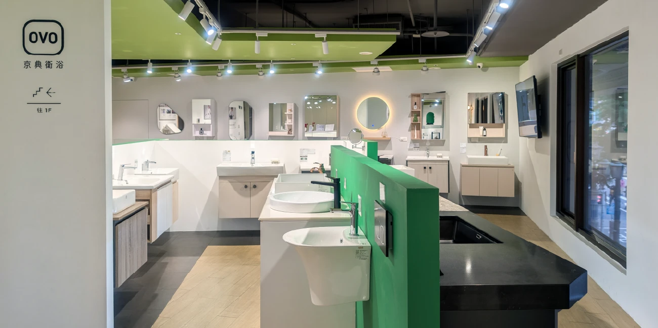 以明亮開放的空間設計,呈現多樣化的衛浴組合。從馬桶、臉盆、浴櫃到淋浴設備,展現整體衛浴的設計美學。透過材質、色系與比例的搭配,營造貼近生活的氛圍,啟發顧客對理想衛浴空間的想像。
