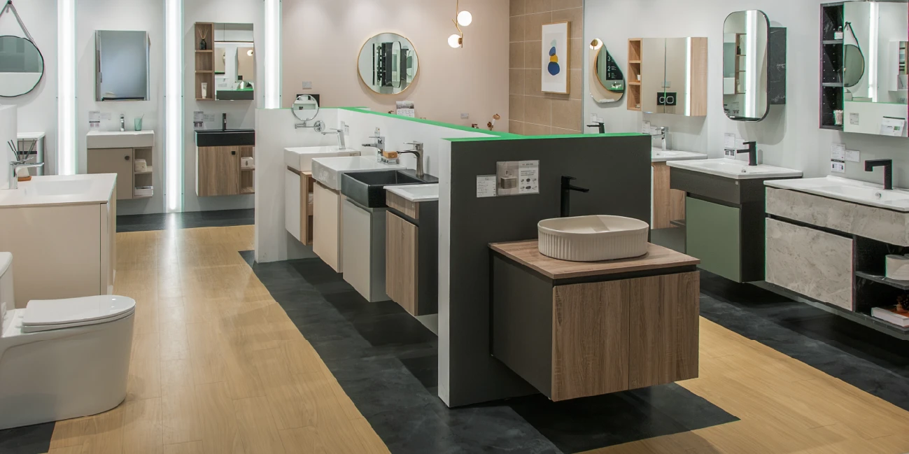 以明亮開放的空間設計,呈現多樣化的衛浴組合。從馬桶、臉盆、浴櫃到淋浴設備,展現整體衛浴的設計美學。透過材質、色系與比例的搭配,營造貼近生活的氛圍,啟發顧客對理想衛浴空間的想像。